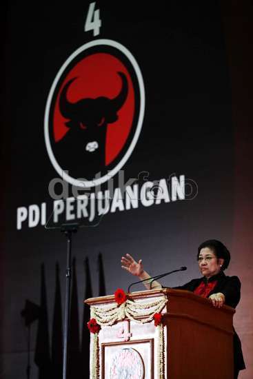 Jakarta - Ketua Umum PDIP Megawati Soekarnoputri menyampaikan orasinya di depan ribuan massa pendukung partai banteng di Surabaya, Jawa Timur. Megawati menyebut Joko Widodo sebagai capres yang memiliki kekuatan besar, meskipun tubuhnya kurus kerempeng.